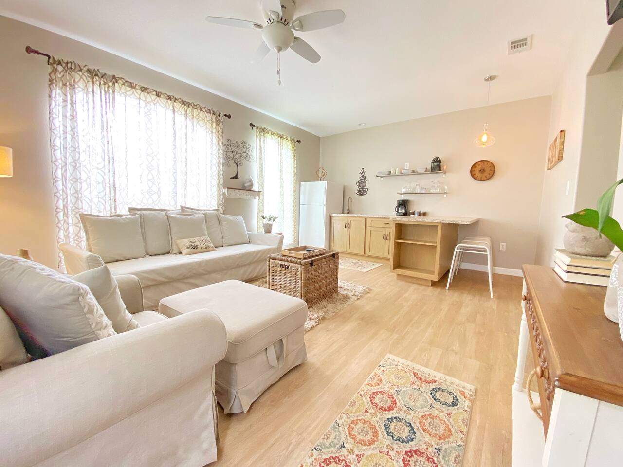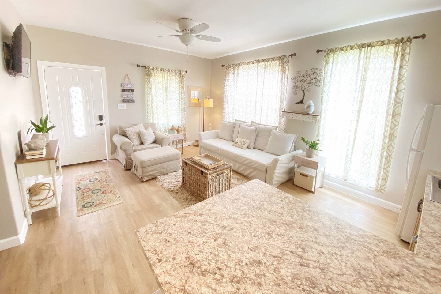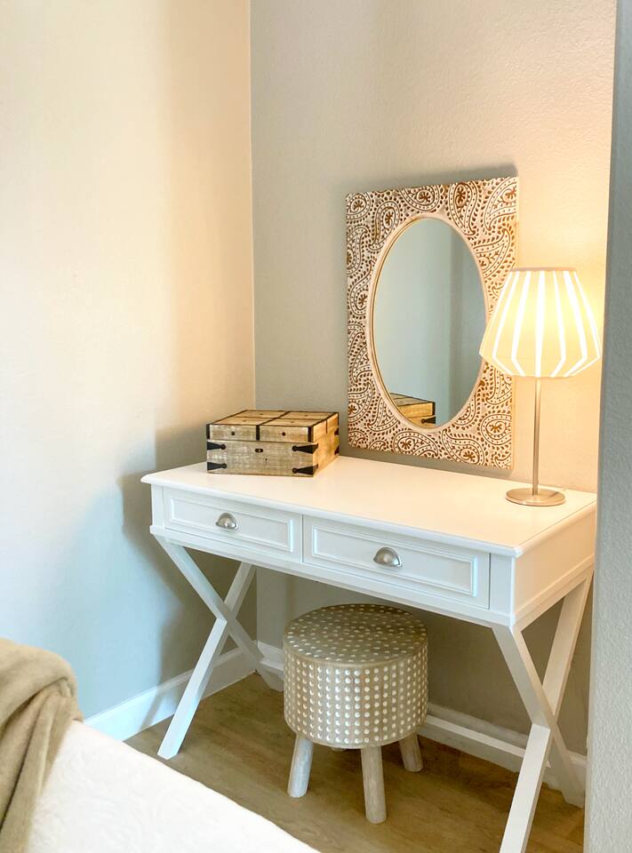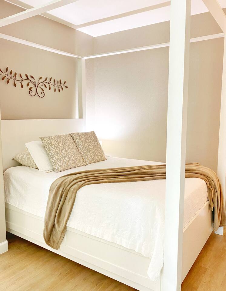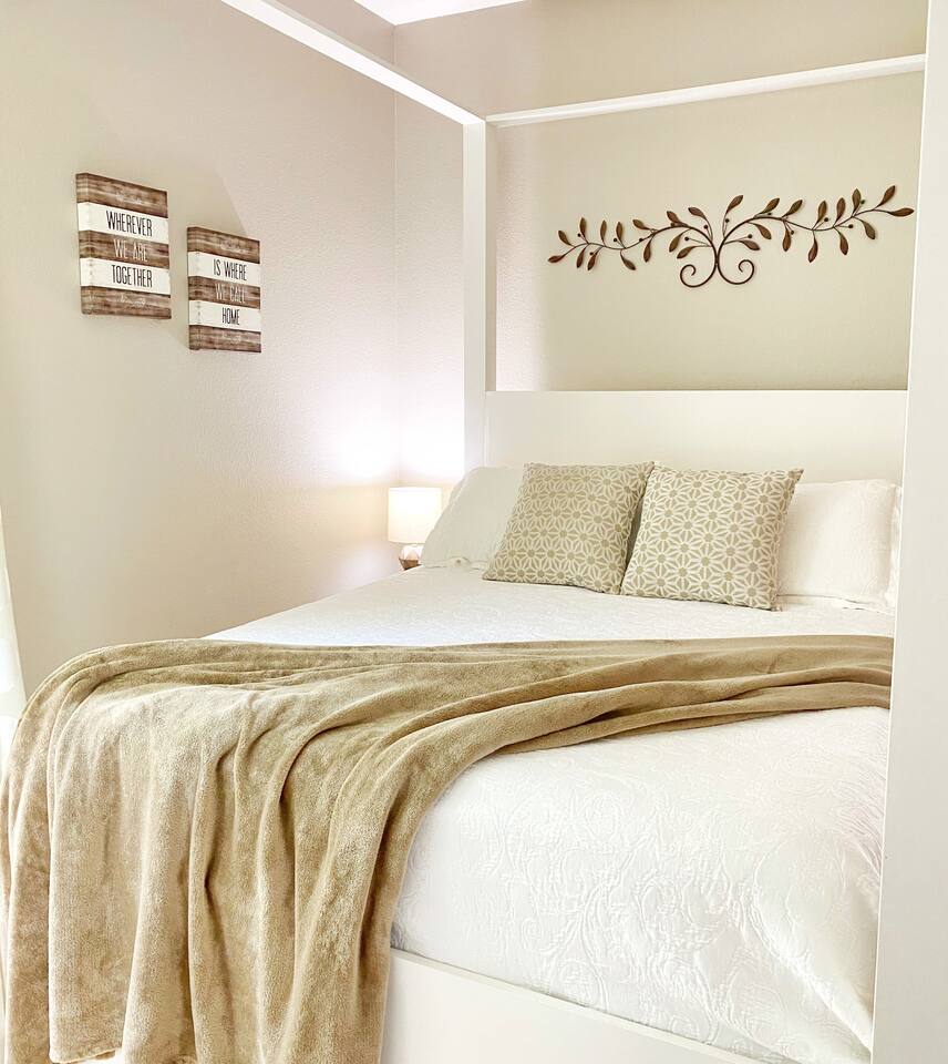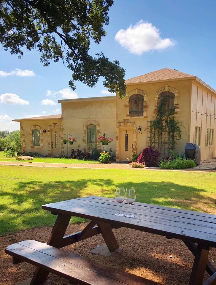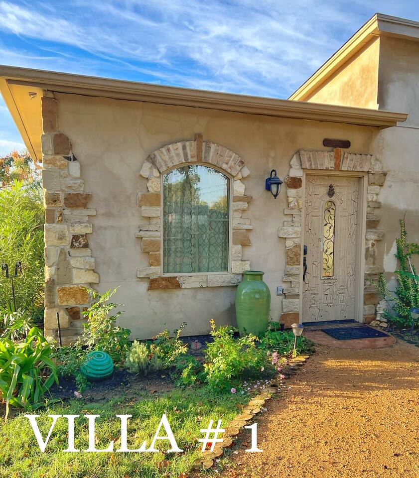 Villa #1 at Fortunata Winery offers the perfect blend of upscale comfort and Texas wine country charm. Thoughtfully designed for relaxation, this spacious villa is just steps from the Fortunata tasting room, making it an ideal escape for wine lovers, couples, or a weekend getaway with friends. Inside, you'll find: Two elegant queen four-poster beds with deluxe linens A pullout sofa for extra guests and a cozy oversized chair A private bath featuring a luxurious spa tub and walk-in shower A welcoming seating area perfect for lounging or enjoying a glass of wine A convenient kitchenette fully stocked with dishes and serving ware, plus an eat-in bar for casual meals Your own private coffee station to start the day right Additional amenities include: - Free WiFi + Cable TV - Toiletries + Fresh Towels - Private entrance + dedicated parking - Walkable access to the tasting room - Quick access to Highway 380 for easy travel Whether you're here to unwind, celebrate, or explore, Villa #1 is a cozy, stylish home base for your Fortunata Winery experience. Sleeps up to 5 guests. No pets allowed.