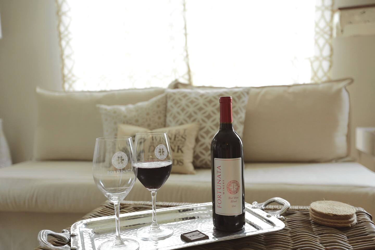 Villa #1 at Fortunata Winery is a stylish, cozy retreat just steps from the Fortunata tasting room. Villa #1 features 2 queen four poster beds, a pullout sofa, oversized chair, deluxe linens, spa tub, walk-in shower, and a large seating area. Enjoy a kitchenette with an eat-in bar, private coffee bar, free WiFi, cable TV, toiletries, private entrance, and parking. Perfect for wine lovers, girls’ getaways, or couples. Sleeps up to 5 guests, no pets allowed. Located just minutes from Highway 380